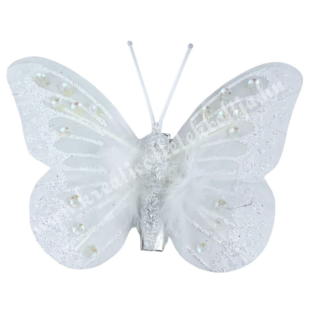 Csipeszes pillangó tollal, fehér, 8x6 cm